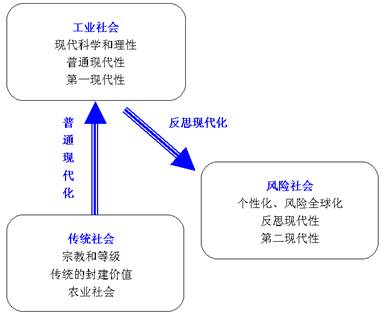 贝克认为:在19世纪,普通现代化分解了农业社会的结构,建立了工业社会;与此相似,今天的反思现代化正在分解工业社会,并产生另一种现代性。这种新出现的现代性就是风险社会(Beck, 1992)。反思现代化就是一个工业社会的创造性破坏的时代,创造性破坏的行为主体不是革命,不是危机,而是西方现代化的胜利(Beck, 1994)。