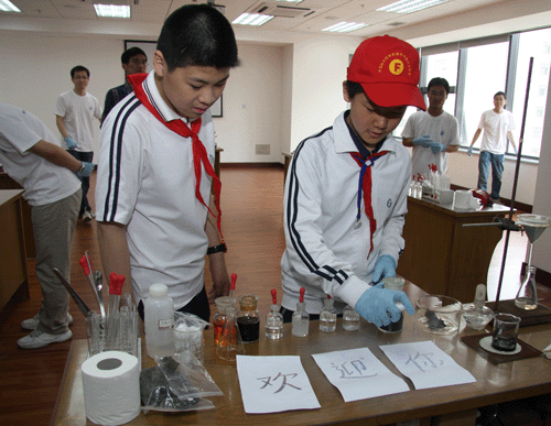 科普专题讲座结束后,来访者在志愿者的引导下分批分别参观了金属有机化学国家重点实验室、生命有机化学国家重点实验室、中科院天然有机化学重点实验室、中科院有机氟化学重点实验室和上海有机所高分子材料研究室集中展示厅。各展厅通过视频、幻灯片、展板、趣味化学实验等多种形式向公众展示了各研究室所涉及的领域及化学与人类生活之间千丝万缕的联系。由各研究室研究员、职工和研究生组成的志愿者们通过耐心讲解和示范,生动地揭示了化学世界的奥妙,来访者兴趣盎然、热情高涨,化学反应过程中产生的颜色和物质形态的变化唤起了大家强烈的兴趣和好奇心。许多同学迫切地想要走进奇妙的化学世界,兴致勃勃地自己动手操作起小实验,体会其中的乐趣所在。