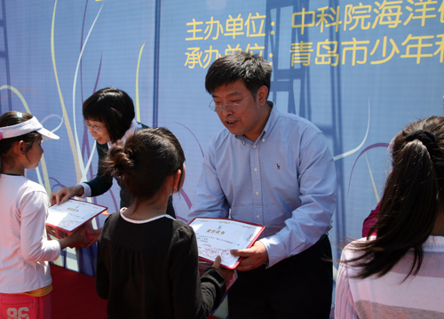 青岛市教育局副局长周民书、科技局副局长栾新、中科院海洋所副所长李铁刚、青岛市少年科学院院长刘海军、中国海洋湖沼学会办公室李毅萍,共同为为获奖的同学颁发了证书和奖品。“我心目中的海洋”主题绘画活动是由中科院海洋所、中国海洋湖沼学会、青岛市少年科学院共同组织、发起的海洋知识科普活动,定于每年的全国科技活动周期间举行,已经成功举办了三届,旨在创造一个海洋科学知识传播平台,充分发挥同学们想象力和创造力,运用手中的画笔,描绘出心目中的海洋,取得了非常好的效果。