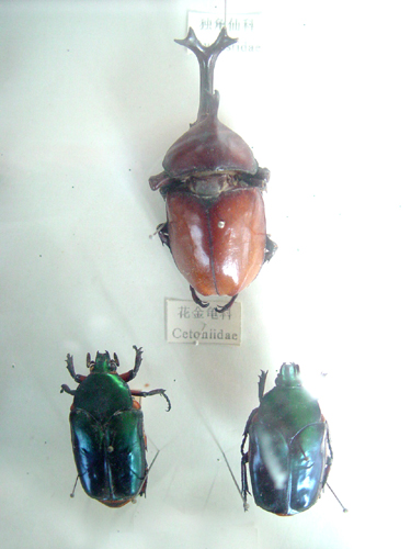 上面那个长着长鼻子的甲虫属独角仙科,下面闪着绿色金属光泽的甲虫属花金龟科。(中国科学院网站记者 段煦摄影)