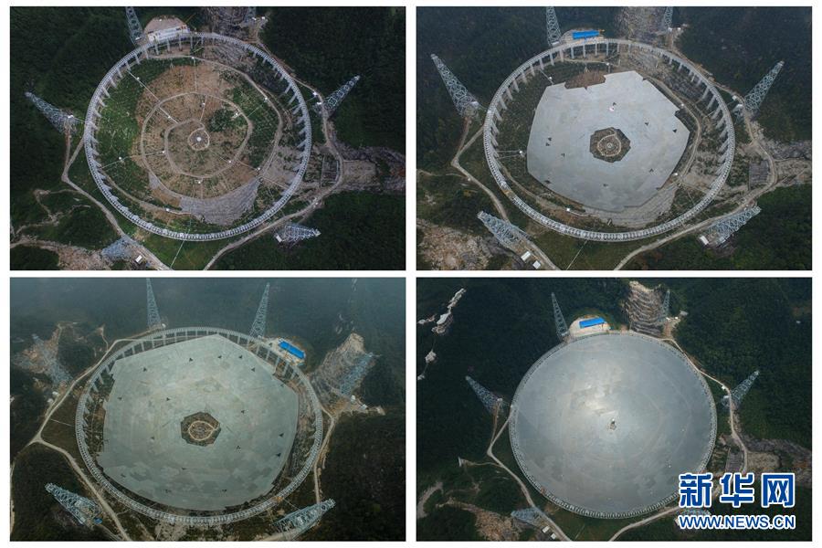 这张拼版照片为FAST项目拼装第一块反射面板(左上,2015年8月2日摄)、FAST反射面板安装近半(右上,2015年12月16日摄)、FAST项目反射面板安装近八成(左下,2016年3月9日摄)、FAST项目面板安装即将完成(右下,2016年6月29日摄)。新华社记者 欧东衢 摄