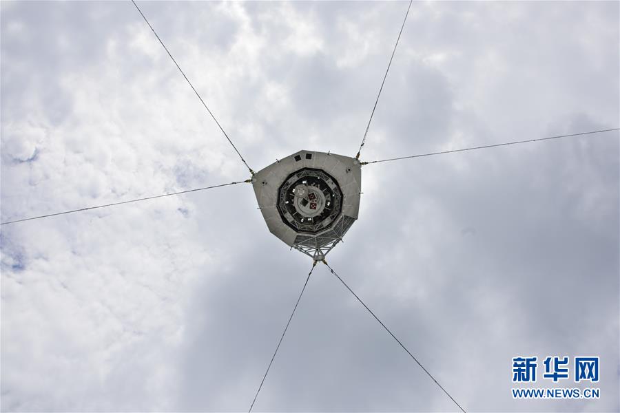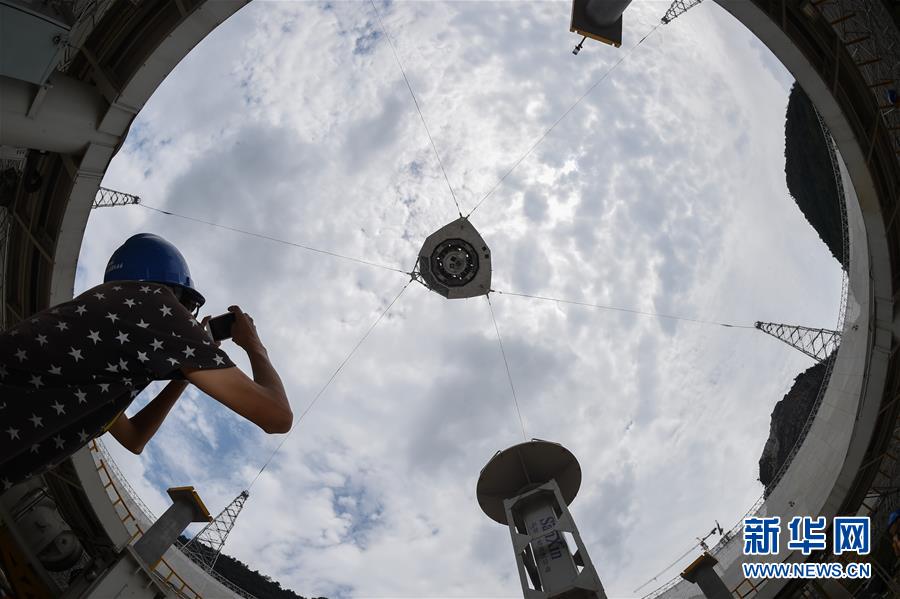 6月29日,500米口径球面射电望远镜(FAST)工程核心部件馈源舱在进行调试。新华社记者 刘续 摄
