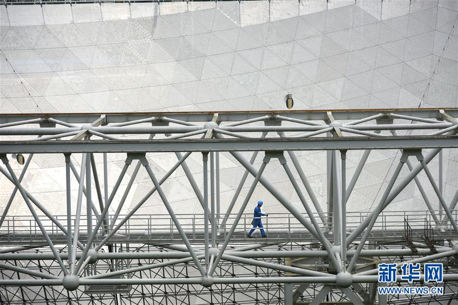 6月29日,一名工作人员走过500米口径球面射电望远镜(FAST)工程反射面板边缘。新华社记者 刘续 摄