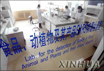 5月13日,中国进出口商品检验技术研究所的专家们在该所“食品、动植物及其产品SARS病毒检测室”内进行检测。由国家质检总局中国进出口商品检验技术研究所自主设计开发并自行实验完成的一种检测食品、动植物及其产品中是否存在“非典”病毒的方法5月8日在京通过专家鉴定。这项技术是国际首创,填补了国内外食品、动植物及其产品“非典”病毒检测领域的空白。新华社记者 陈建力摄 5月7日,又一项防控“非典”(SARS)重要技术问世——我国率先攻克并掌握从食品、动植物及其产品中检测“非典”病毒的方法。