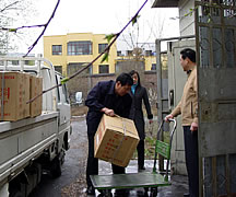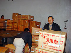 新疆分院支援北京人民抗击非典,傅春利书记在搬运口罩。