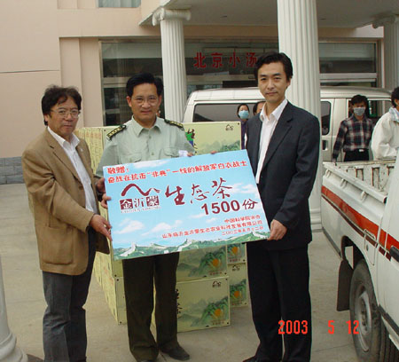 张院长接收慰问品 5月12日是护士节,应金沂蒙生态农业科技发展有限公司总经理王卫星的邀请,中科院农办副主任王大生当天下午携带1500份、价值80多万元的无公害优质金沂蒙生态茶前往中国人民解放军小汤山医院,慰问正战斗在抗击非典第一线的白衣战士。