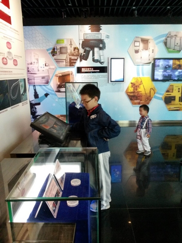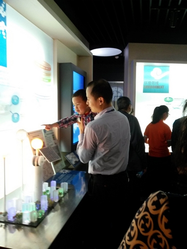 在实物展示纳米所科研成果的小展厅里,志愿者讲解员发挥自己平日所学,就纳米科技的国际趋势、国内发展、所内优势及纳米所相关科研成果做了详细的讲解和答疑。