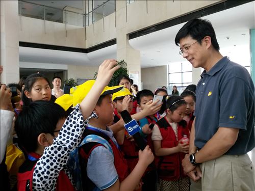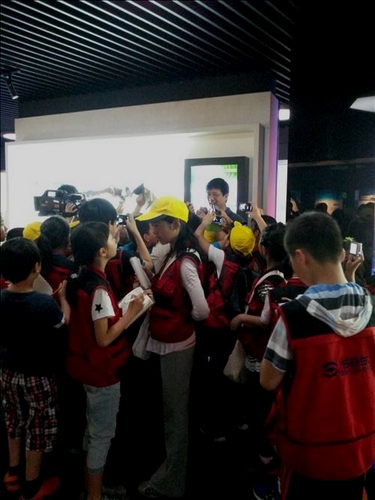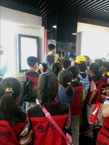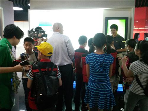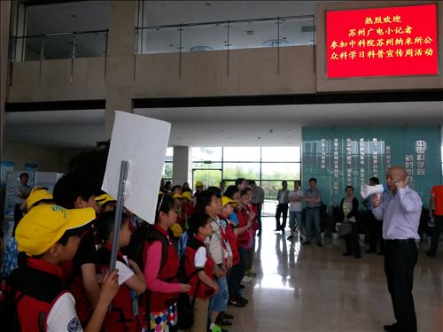5月24日下午,在全国科普宣传周接近尾声,“六一”国际儿童节来临之际,苏州广电小记者走进苏州纳米所,零距离采访大科学家的童年梦想。苏州纳米所国际实验室主任张跃钢博士分别在展厅和大厅与充满好奇的小记者们亲切交流。60名小记者及其老师、家长齐聚苏州纳米所,现场采访热闹火爆,为2014年中科院苏州纳米所公众活动日、科普宣传周活动画上完美的句号。