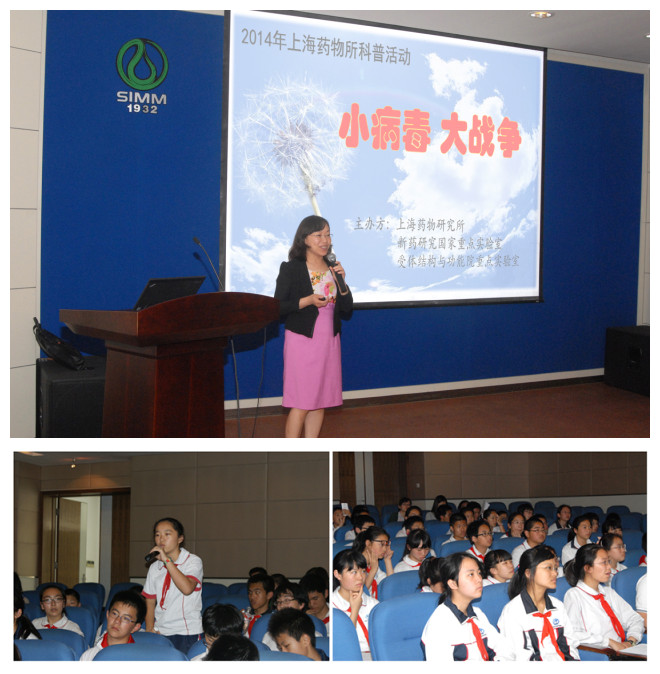 《小病毒大战争》,是龙亚秋研究员为本次活动精心准备讲座,该讲座也是上海科普大讲坛普及系列讲座。电镜下像梵高画风的病毒图片、人类和病毒的战斗史中的经典故事,病毒如何感染人体复制自己的动画,让同学们始终跟随着龙亚秋研究员的精彩讲述。抗病毒的“鸡尾酒疗法”、“一石二鸟”的药物研发策略,即便是深奥的药物研发科学问题,同学们也听得津津有味,有同学追问关于针对病毒变异的新药研发途径,还有同学提问病毒性疾病药物设计的结构靶向性,认真的讨论和有深度的提问让人赞叹。