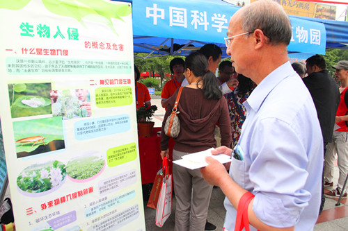 科技周期间,武汉植物园园区内活动也是精彩纷呈。园内组织了国内首个展示入侵生物和生物安全宣传教育的展览,加拿大一枝黄花、美洲商陆、苏门白酒草、豚草等25种常见的入侵植物以活体植物的形式展示。科普工作者还开展科普讲座,让公众了解入侵生物的概念、传入途径等基本知识。 武汉植物园还利用先进的二维码和NFC技术为十种常见的外来入侵植物制作了铭牌,公众只需利用智能手机扫描外来入侵植物上的NFC和二维码便可获取相关的植物知识。