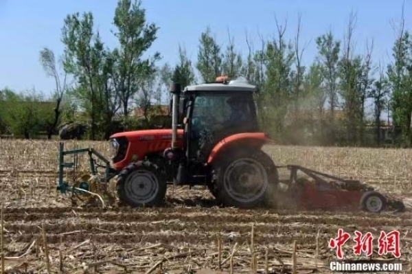 5月11日,探访中国科学院“黑土粮仓”科技会战“梨树模式”示范区,“梨树模式”研发的专用秸杆覆盖条耕机在万亩示范区现场作业。“梨树模式”是由中科院东北地理与农业生态研究所、沈阳应用生态研究所和中国农业大学合作研究开发的保护性耕作模式,最早在吉林省梨树县建立研究基地并推广示范而得名,为因地制宜开展东北黑土地保护与利用提供系统解决方案。中新社记者孙自法 摄