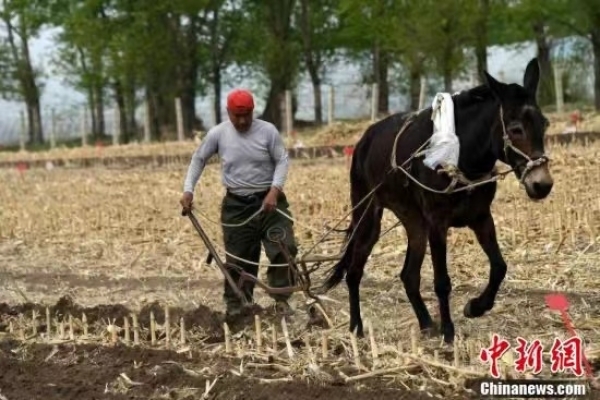 5月11日,探访中国科学院“黑土粮仓”科技会战“梨树模式”示范区,中科院沈阳应用生态研究所科研人员在示范区基地一处对比研究区域内,雇请当地农民以传统骡子拉犁方式在实验用地上作业。“梨树模式”是由中科院东北地理与农业生态研究所、沈阳应用生态研究所和中国农业大学合作研究开发的保护性耕作模式,最早在吉林省梨树县建立研究基地并推广示范而得名,为因地制宜开展东北黑土地保护与利用提供系统解决方案。中新社记者孙自法 摄