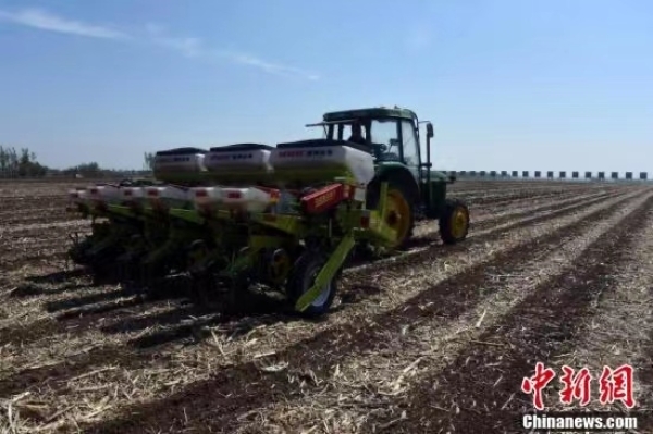5月11日,探访中国科学院“黑土粮仓”科技会战“梨树模式”示范区,“梨树模式”研发的免耕播种机在万亩示范区现场作业。“梨树模式”是由中科院东北地理与农业生态研究所、沈阳应用生态研究所和中国农业大学合作研究开发的保护性耕作模式,最早在吉林省梨树县建立研究基地并推广示范而得名,为因地制宜开展东北黑土地保护与利用提供系统解决方案。中新社记者孙自法 摄 |