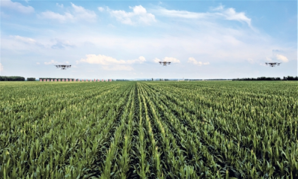 “梨树模式”百万亩核心绿色玉米生产基地无人机飞防。