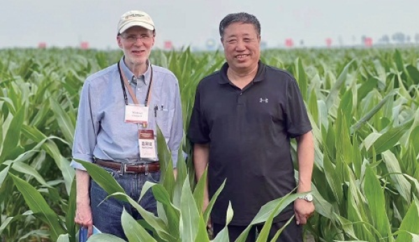 吉林省农业科学院全国玉米栽培和黑土地保护专家王立春(右)在公主岭黑土地保护实验基地接待美国土壤学会理事长汤普森,为其讲解吉林省黑土地保护技术。
