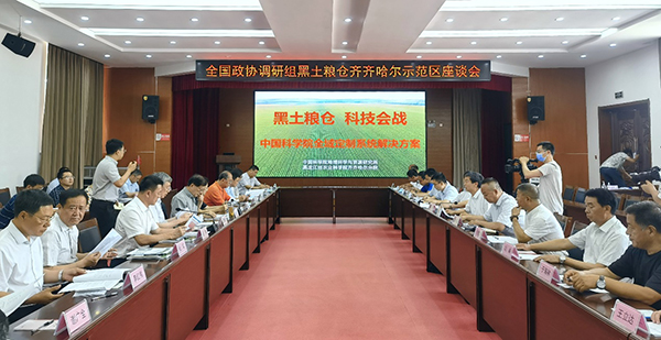 7月11日,全国政协调研组赴黑龙江省齐齐哈尔示范区开展“加强黑土地保护”专题调研,与示范区共建单位代表及青年突击队员召开座谈会。调研组听取了中国科学院“黑土粮仓”科技会战工作情况介绍和齐齐哈尔示范区建设进展汇报,并就黑土地退化本底数据、黑土地保护技术应用等内容展开了交流。7月12日,调研组实地考察了齐齐哈尔市依安县攻关试验区和10万亩核心示范区,详细调研了示范区有机农业品种优选试验进展、天-地-空农情监测系统、土地规模经营与乡村振兴融合模式和智能除草机装备应用进展情况。在依安县太东乡沿江村,调研组与当地农业龙头企业、种植大户、农机合作社、村民代表座谈,深入讨论了黑土地保护与有机转换中面临的问题及应对对策。