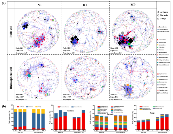 中国科学院东北地理与农业生态研究所农田分子生态学科组和黑土有机碳与保护性耕作学科组,对免耕(NT)、少耕(RT)和传统耕作(MP)处理下土壤微生物群落组成、装配过程和分子网络结构进行解析,探讨了保护性耕作下黑土农田土壤微生物群落结构演替及发生机制对土壤质量和作物生产力的影响。研究结果表明,不同耕作方式显著改变了根际和非根际土壤微生物群落,与传统耕作MP相比,保护性耕作NT和RT显著增加了硝化菌Nitrosospira sp.和固氮菌Mesorhizobium sp., Bradyrhizobium sp.和Burkholderia sp.相对丰度,但降低了具有有机质物分解功能的Blastococcus sp., Streptomyces sp.和Sphingomonas sp.相对丰度。网络分析和随机森林分析发现,上述功能菌在NT和RT处理中被注释为关键物种,这表明保护性耕作更有助于土壤碳固定,并促进土壤的生物固氮和硝化作用。