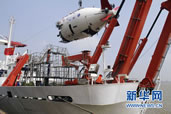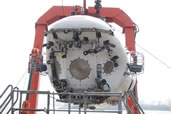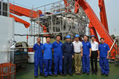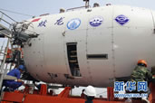 工作人员正在船上安装“蛟龙号”载人深潜器。