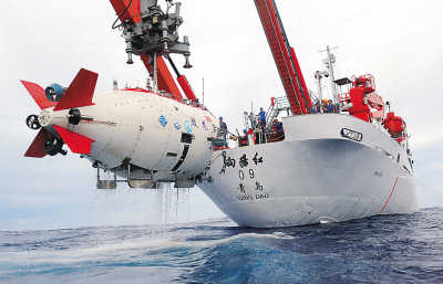 第6次载人7000米级海试任务圆满结束后,“蛟龙”号被吊起收回“向阳红九号” 母船。新华社记者 周文杰摄