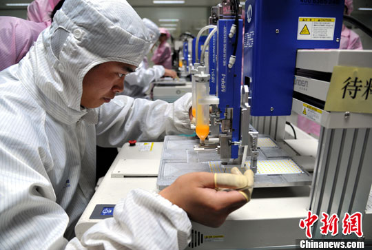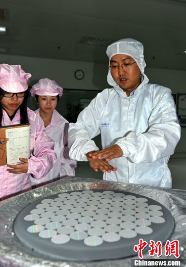 10月13日,中国科学院苏州纳米技术与纳米仿生研究所和企业联合创办的苏州新纳晶光电有限公司内,工作人员正在LED灯制造流水线上进行芯片处理作业。中新社发 孙自法 摄