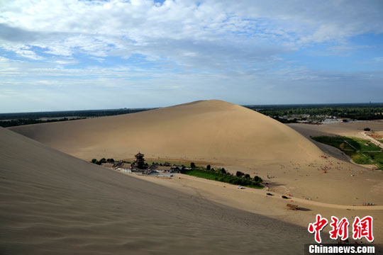 8月15日,敦煌鸣沙山风景区内,知名核心景点月牙泉水位降低,面积也日渐萎缩。中新社发 孙自法 摄