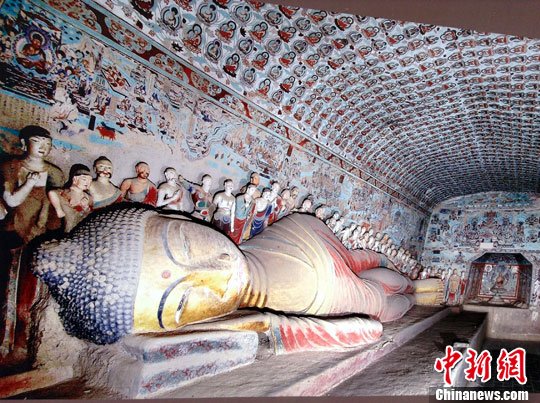 8月15日,敦煌莫高窟保护区内,因保护文物需要,所有洞窟不能拍照。敦煌研究院为让观众更好参观,在保护区内悬挂很多不同洞窟佛像、壁画等精美文物和艺术品图片,供观众欣赏。图为莫高窟第148窟内一尊卧佛侧身而卧的壮观场面。(翻拍图片)中新社发 孙自法 摄