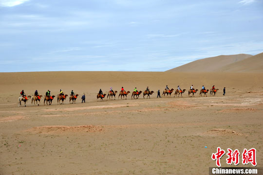 8月15日,敦煌鸣沙山风景区内,游客骑上骆驼组队穿行沙漠,体验当地风情。中新社发 孙自法 摄