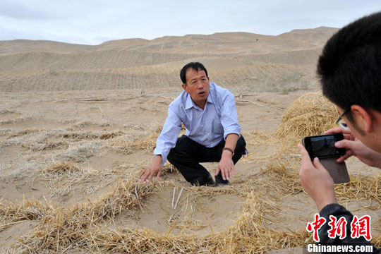 8月15日,中国科学院寒区旱区环境与工程研究所敦煌戈壁荒漠研究站站长、被誉为“大漠游侠”的风沙防治专家屈建军研究员,在敦煌莫高窟崖顶上一片草方格阻沙带介绍自己情系敦煌,25年来致力于莫高窟风沙危害防治研究进展及成果应用情况。中新社发 孙自法 摄