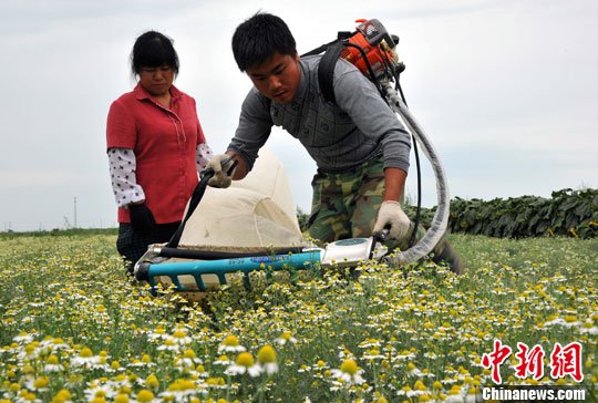 8月11日,新疆古尔班通古特沙漠,克拉玛依小拐乡一处盐碱地上,中国科学院新疆生态与地理研究所与当地合作实验示范种植的洋甘菊正在人力与机器协作进行收割,据介绍,洋甘菊可用来制茶,也可提取精油,经济价值较高。