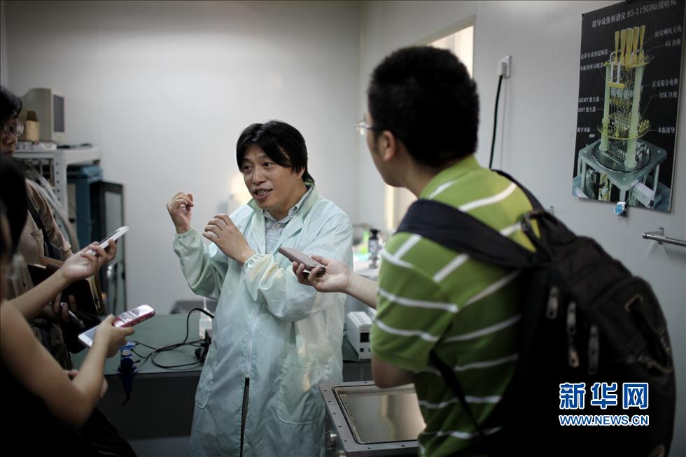 史生才研究员(中)在介绍应用在毫米波射电望远镜上的超导成像频谱仪。利用安装在13.7米毫米波望远镜上的超导成像频谱仪,南京市中科院紫金山天文台的研究人员提出银河关键切面——银道面巡天计划,即“银河画卷计划”。该计划将利用8-10年的时间完成该区域数据获取和处理任务,实现重要恒星形成区的微观组成、年轻星天体的发现等一系列科学目标,对于研究恒星和行星的起源和演化规律起着重要作用。该计划于2011年11月正式开始,至今已完成巡天计划的五分之一,取得了超新星遗迹、天鹰座、双子座、北美星云性质分子云等天区的数据。新华社记者 金立旺摄