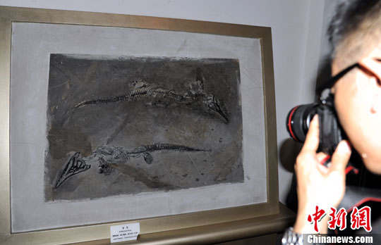 7月31日,中国科学院南京地质古生物研究所旗下南京古生物博物馆内,展示发现采集于贵州的距今约2.1亿年、晚三叠世时期的鱼龙化石,吸引媒体关注。中新社发 孙自法 摄