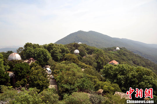 7月30日,在南京紫金山天城堡上,紫金山上的林荫丛中,中国科学院紫金山天文台多个天文观测设备星罗棋布于其间,颇为壮观。中新社发 孙自法 摄