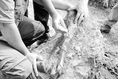 科考人员用胶对化石破碎部分进行保护。李庆盛摄