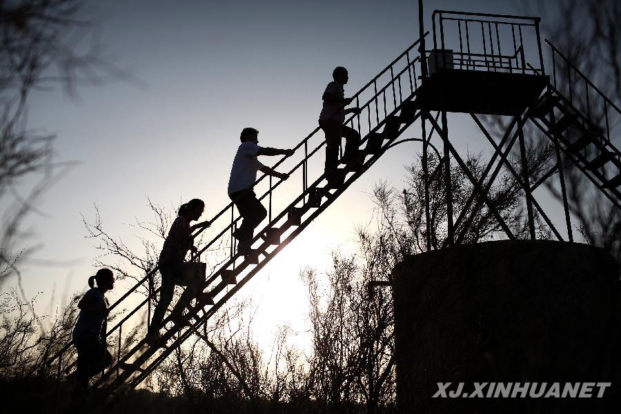 8月10日,研究人员登上中科院新疆生态与地理研究所吐鲁番沙漠植物园的瞭望塔查看情况。