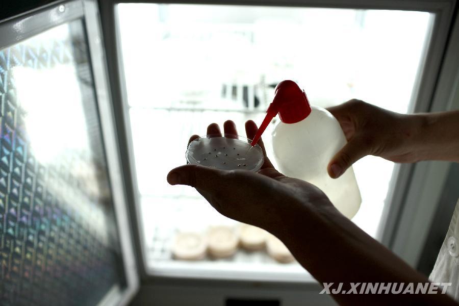 8月10日,研究人员布海丽在中科院新疆生态与地理研究所吐鲁番沙漠植物园的实验室里给保育的种子喷水。