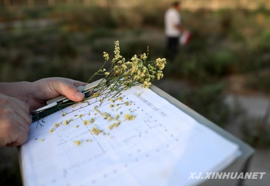 8月10日,研究人员在中科院新疆生态与地理研究所吐鲁番沙漠植物园的苗圃里采集标本,登记当日数据。