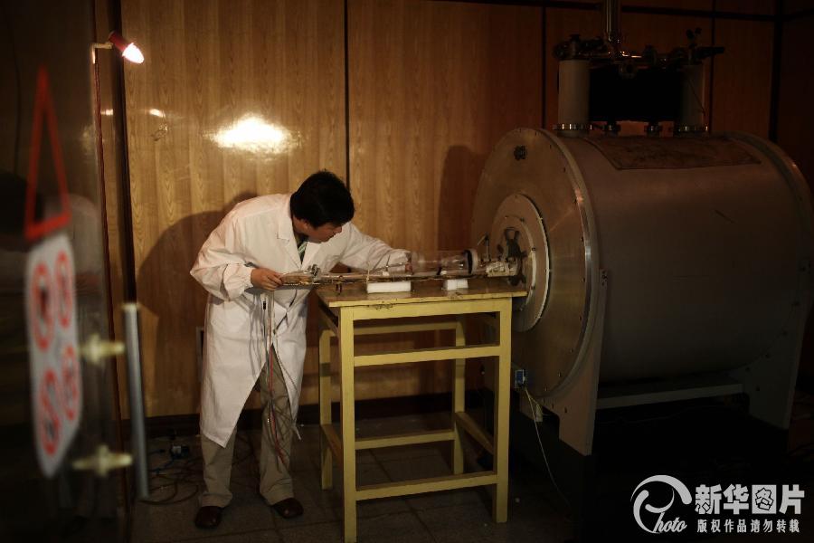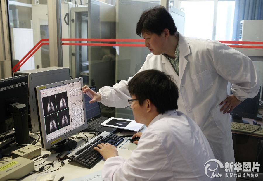 2013年8月1日 中科院磁共振成像仪“点亮肺部” 8月1日,在中科院武汉物理与数学研究所实验室,周欣研究员(后)正在和团队成员研究获得的国内首幅小动物活体肺部磁共振成像。周欣研究员领衔的研究团队是目前国内唯一开展超极化气体肺部磁共振(MRI)成像的研究组,他们的研究目的是“点亮肺部”,不仅获得目前胸透、CT和PET等肺部成像手段可以获得的肺部结构信息,还将对肺部气体交换功能进行可视化研究,从而开展人体肺部重大疾病的诊断前研究。目前,该团队已成功获得国内首幅小动物活体肺部的MRI影像,预计四年左右以后可以开展临床研究。新华社记者 金立旺 摄