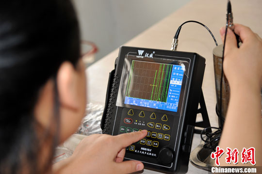 8月1日,中科院武汉物理与数学研究所中科创新公司内,工作人员正在测试一款超声波检测仪。据介绍,该公司是中科院武汉物数所成立的超声无损检测设备产业化平台,其产品既有手持便携式,又有大型成套全自动多通道超声波检测设备,目前已累计销售上万台套。中新社发 孙自法 摄