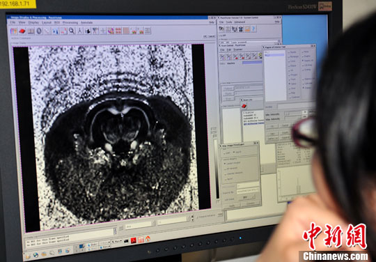 中国科学院武汉物理与数学研究所科研人员在实验室内,利用磁共振成像仪开展大鼠脑部磁共振影像研究。中新社发 孙自法 摄