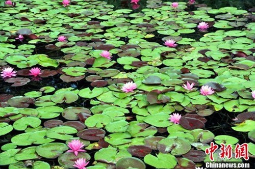 8月2日,盛夏时节踏访中国科学院武汉植物园,水面上睡莲成片怒放,令观者赏心悦目。中新社发 孙自法 摄