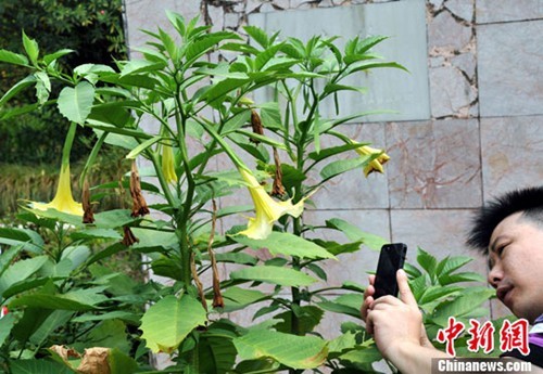 8月2日,盛夏时节踏访中国科学院武汉植物园,同株曼陀罗上,既有花开也有花谢,引人瞩目。中新社发 孙自法 摄