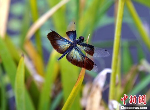 8月2日,盛夏时节踏访中国科学院武汉植物园,水草中一只蜻蜓展翅飞翔,远远看去宛若蝴蝶。中新社发 孙自法 摄