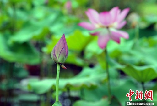 8月2日,盛夏时节踏访中国科学院武汉植物园,水面上小荷已露尖尖角与周边盛开的荷花相映成趣。中新社发 孙自法 摄