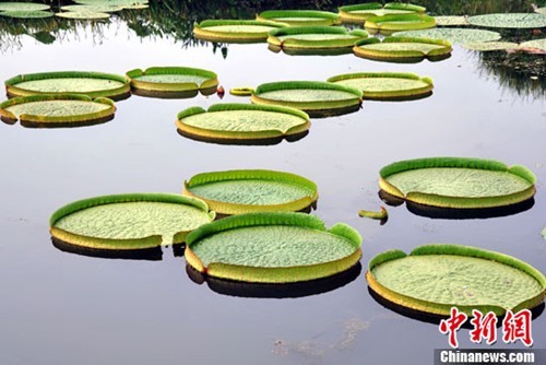 8月2日,盛夏时节踏访中国科学院武汉植物园,水面上巨大的王莲“成群结队”,颇显王者气派。中新社发 孙自法 摄