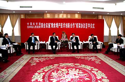 3月4日下午,中国科学院副院长李家洋与吉林省常务副省长竺延风代表院省双方在北京签署了“联合实施‘粮食增产技术创新合作’框架协议”。中国科学院常务副院长白春礼、吉林省省长韩长赋等领导出席签字仪式并讲话。施尔畏副院长主持仪式。