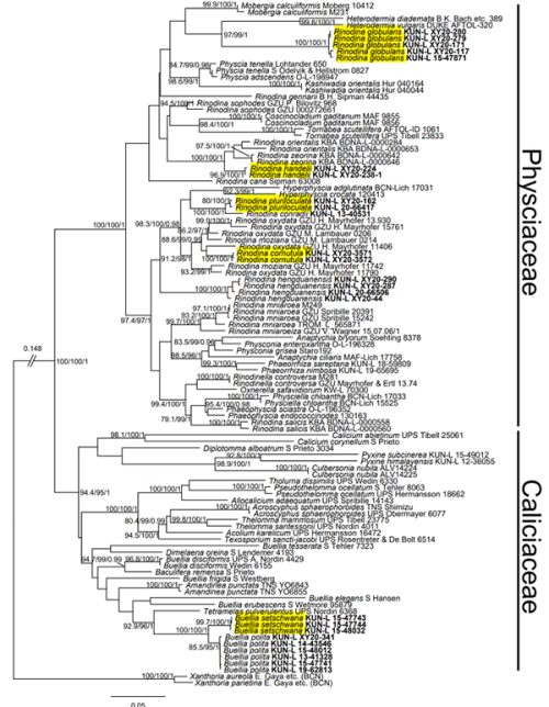 近年来,地衣专题组成员多次重走Handel-Mazzetti的采集路线,并在这些物种的原产地进行了网格化的系统采集,获得了大量新材料,通过借阅相关模式标本,从形态学、解剖学、化学和生境特征开展研究,并结合多基因分子系统学的方法对这些物种开展系统发育分析,明确了其系统位置,对这些物种进行了更清晰的分类界定。