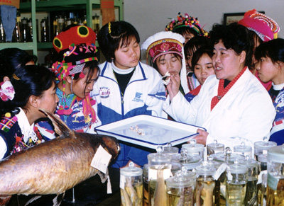 崔桂华同志在为各族青少年讲授鱼类知识。