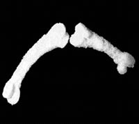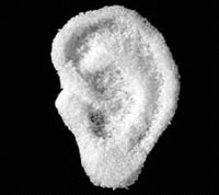 可能有人会说“骨头是可以再生的”。不错,可是人体有些特定的骨组织自身修复能力有限,例如关节软骨损伤。由于关节软骨是无血管、淋巴管和神经的组织,其自身修复能力有限,损伤后常导致关节功能活动障碍。我们通常所说的“伤筋动骨一百天”也就是形容了骨头再生的缓慢给人们带来的痛苦。除此以外,在日常生活中,我们还会碰到因为严重创伤需要进行骨替换的情况,如截肢或骨肿瘤清除后的修复。因此,人工骨的研究具有很深远的意义。 由于人的骨头大体上是由有机和无机两部分组成的,因此人工骨材料的组成也逐渐形成了以有机和无机复合材料为主的趋势。通常情况下,我们将这种复合材料制备成多孔的类似于泡沫状的“支架”,实际上它的功能类似一座“桥梁”。因为待骨组织生长到具有一定强度时,这座“桥梁”会在体内的生物环境中逐渐降解成人体可以靠新陈代谢排出的一些产物,这个时候它就“功成身退”了。这个“桥梁”必须具有一定数量的孔并且孔的大小要适度,孔和孔之间要互相连接。不仅如此,这个“桥梁”有时还必须具有一定的强度和我们所需要的形状。图一就是一张典型的“耳朵和腿骨支架”的图片。为什么会有这么多的要求呢?这是因为这个“桥梁”在一定情况下必须在人体内承担起自然骨的负重,如果强度过太低,在骨还没有形成之前降解,就起不到“桥梁”的作用了。如果强度太高,骨组织都已经长好了,“支架”还没有降解,在人体内又会产生一些副作用。 除了搭这个“桥梁”以外,我们还必须在这个“桥梁”上种植一些有生命力的东西,这就是“骨细胞”。这些有生命力的“骨细胞”是形成骨组织从而修复骨缺损的“主力军”。没有了它们,就不能称为“活体骨”了。将这些种植了“骨细胞”的支架放在适当的环境中培育一定的时间,待这些“骨细胞”适应了“支架”这个环境开始生长、繁殖并形成一定的骨组织时,再将这个已经是“活体骨”的组织植入体内去修复骨缺损的部位。骨细胞会在支架逐渐降解时继续增生繁殖,达到修复骨创伤和重建骨的目的。图二就是细胞的提取和种植示意图 那么待“人工骨”植入体内后,它能很好地发挥作用吗?有人拿动物做了实验。在一只老鼠的背上人为地制造一块软骨的破坏,然后将“人工软骨”种植进去,一定时间后观察到这只老鼠没有任何异常,健康如常。图三就是只老鼠在开始种植人工软骨和最后修复成功后的照片。
