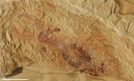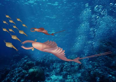 古生物巡回展上的奇虾化石和奇虾猎食图