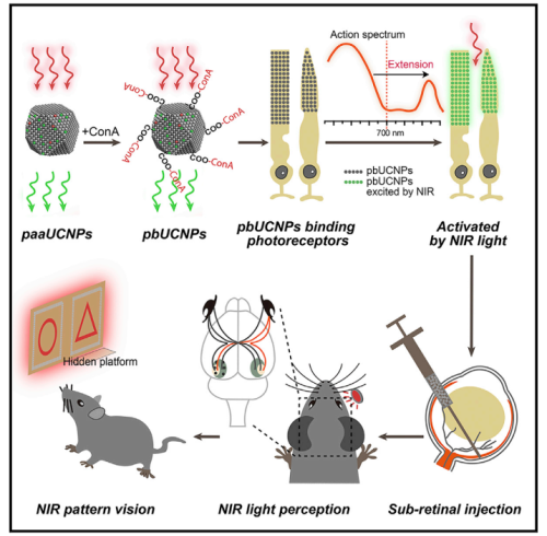 通过中国科学院B类战略性先导科技专项(培育)“衰老的生物学基础和干预策略”组织实施,中国科学技术大学研究团队利用自主发明的纳米颗粒表面修饰方法,将可吸收红外光发出可见光的上转换纳米材料导入动物视网膜,在国际上首次使哺乳动物具备红外图像视觉感知能力,拓展了哺乳动物的视觉波谱范围。研究成果于2019年2月28日发表在《细胞》杂志上。利用这项技术,通过开发具有不同吸收和发射光谱参数的纳米材料,将有可能辅助修复红色色盲等视觉感知波谱缺陷相关疾病。